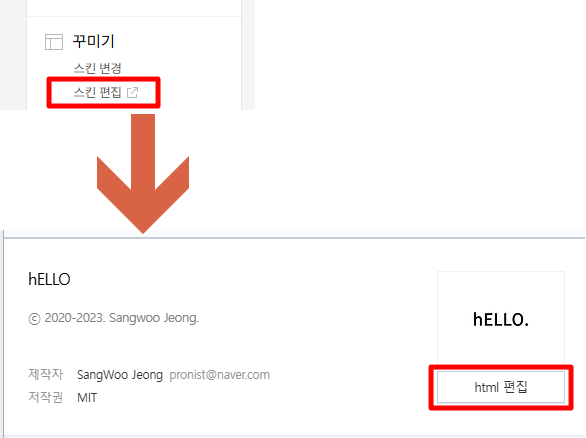 - 꾸미기 → 스킨 편집 → HTML 편집을 클릭합니다.