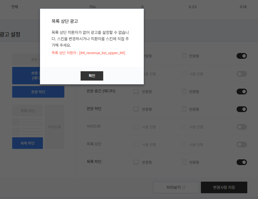 목록 상단·하단 광고 설정이 되지 않는 이유