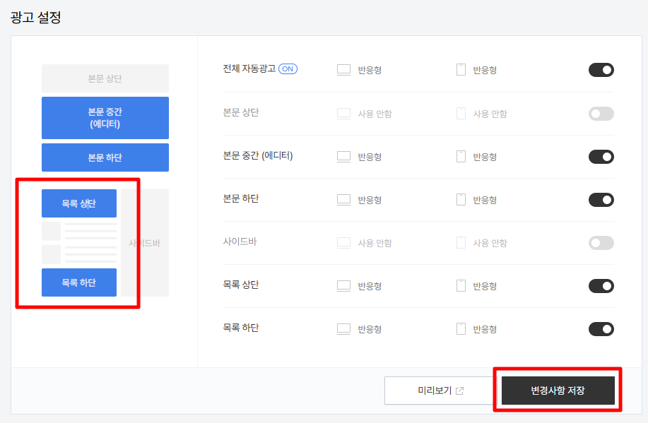 관리화면 →애드센스 화면으로 이동한 후, 광고 설정에서 목록 상단, 목록 하단을 클릭 후 변경사항 저장을 합니다.