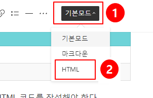 1. 글 작성 모드를 "기본모드" 에서 "HTML" 로 변경하기