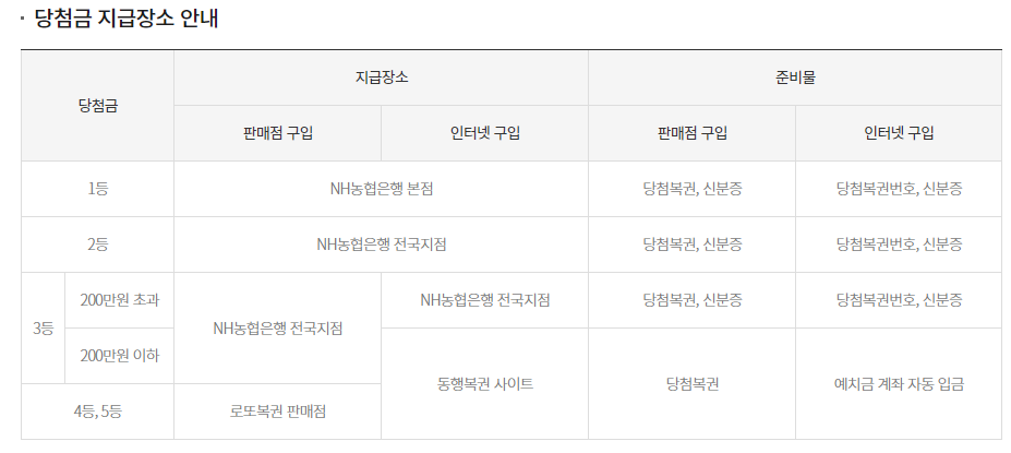 동행복권 홈페이지에 당첨금에 따른 지급 설명이 있다.