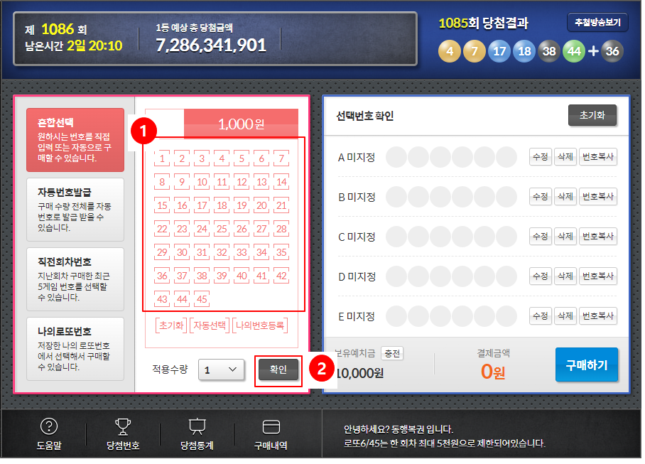 선택된 번호를 확인하고 구매하기 버튼을 누른다.
