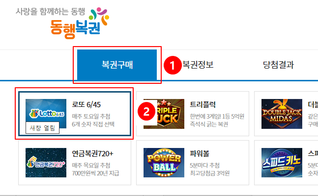 복권 구매를 클릭 후 로또 6/45를 클릭한다.