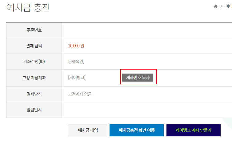 계좌번호 복사를 해서 결제 금액을 입금하면 된다.