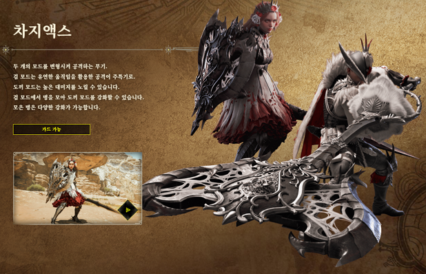 차지 액스는 검 모드와 도끼 모드를 오가며 전투하는 변형 무기입니다.