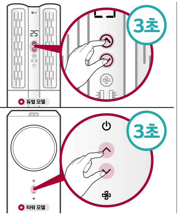- 온도 올림(▲) 버튼과 온도 내림(▼) 버튼을 동시에 3초간 누르기