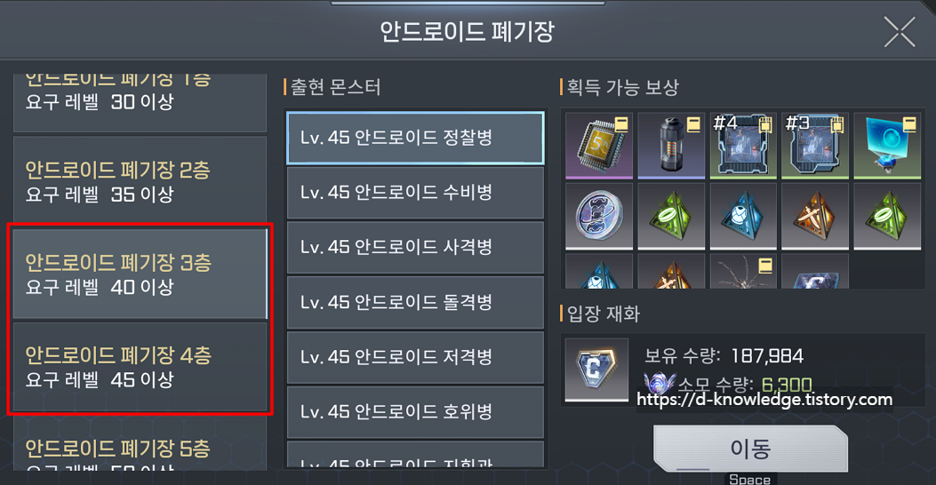 - 3층 vs 4층: 드랍 아이템 동일 → 3층에서 사냥 진행!