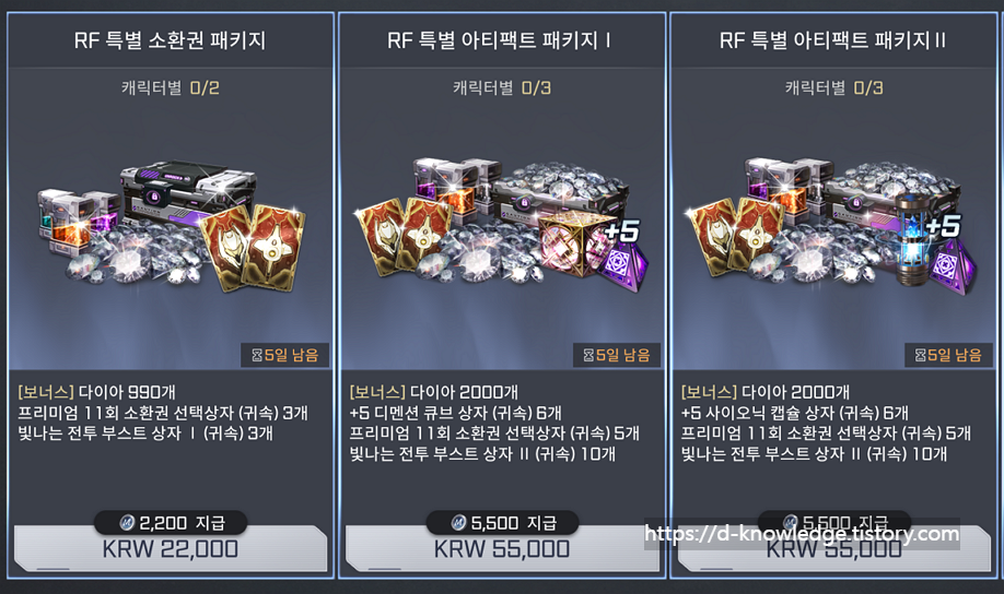 | RF 특별 아티팩트 패키지 II | 55,000원 | 11회 소환권 5개 +기타 아이템 |