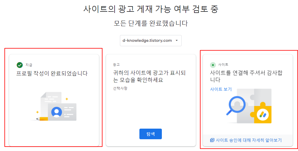 나의 경우는 프로필 작성 및 사이트 연결을 완료하여 사이트의 광고 게재 가능 여부 검토 중 상태이다.