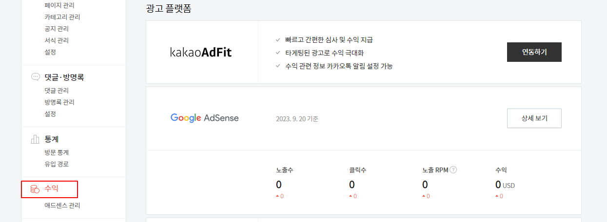 티스토리 블로그 관리 화면 좌측 사이드에 수익 버튼을 클릭하면 위 사진과 같이 나오는데,