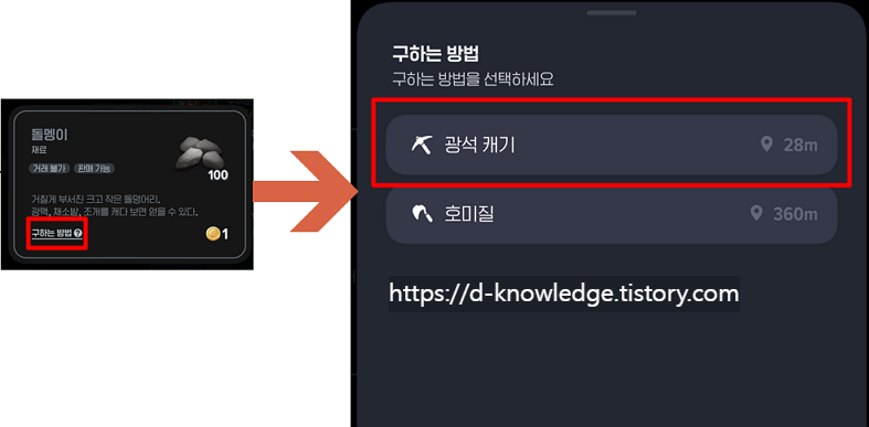 - 제작 재료인 ‘돌멩이’를 클릭하면, 해당 재료를 구하는 방법을 선택하는 화면이 나옵니다.