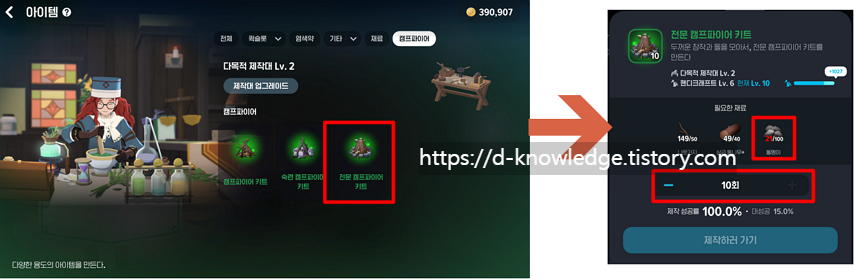 - 여기서 ‘전문 캠프파이어 키트’를 10개 클릭합니다.