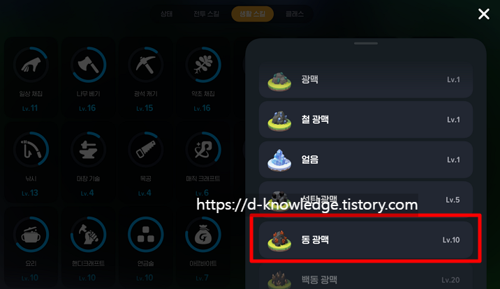 - 우선, 생활 스킬 메뉴에서 광석 캐기를 클릭 후 동광맥에서 구하는 법을 클릭하세요.