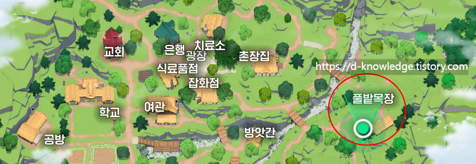 - 외양간처럼 생긴 건물 옆 풀숲을 살펴보세요.