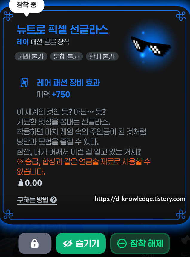 이벤트 보상 아이템은 뉴트로 픽셀 선글라스로 매력이 무려 +750이나 올려주는 패션 아이템입니다.