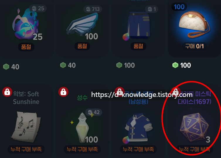 즉, 순서대로 아이템을 구매해야 누적 구매가 쌓여 다이스를 구매할 수 있습니다. ✅