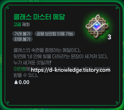 엠블럼은 던바튼의 NPC '아란웬'에게서 구매할 수 있으며, 클래스 마스터 메달이 필요합니다.