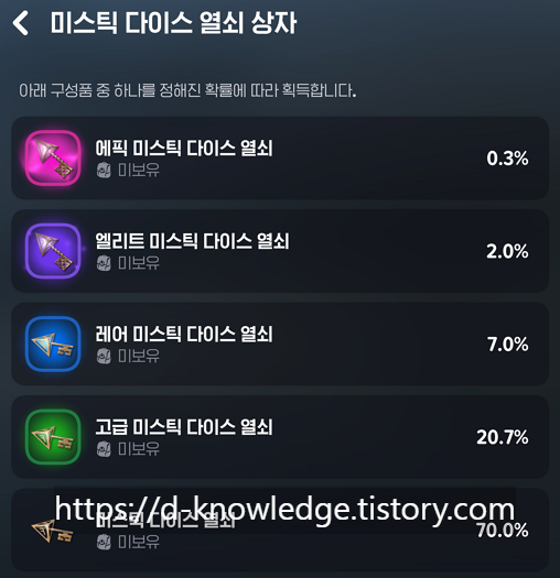 🎯 고등급 다이스키일수록 더 강력한 미스틱 다이스를 열 수 있으므로, 최대한 높은 등급을 노리자!