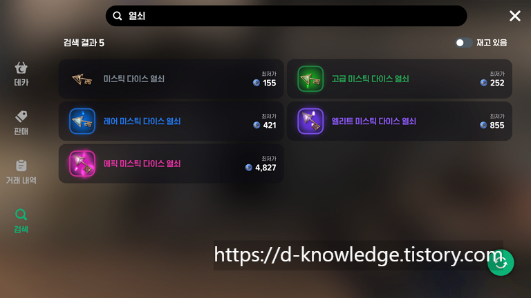 거래소에서는 미스틱 다이스 열쇠를 데카(게임 내 화폐)로 구매할 수도 있다.