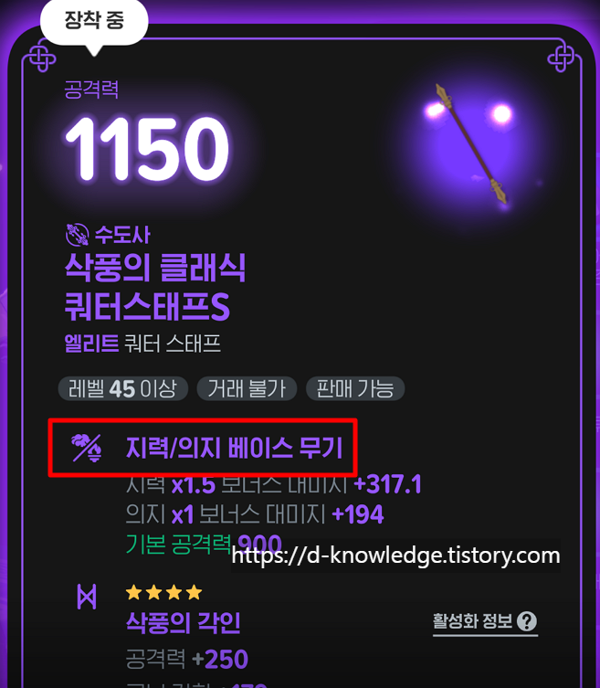 현재 장착하고 있는 무기의 설명을 보면 어떤 능력치 주요 능력치 인지 확인 할 수 있습니다.