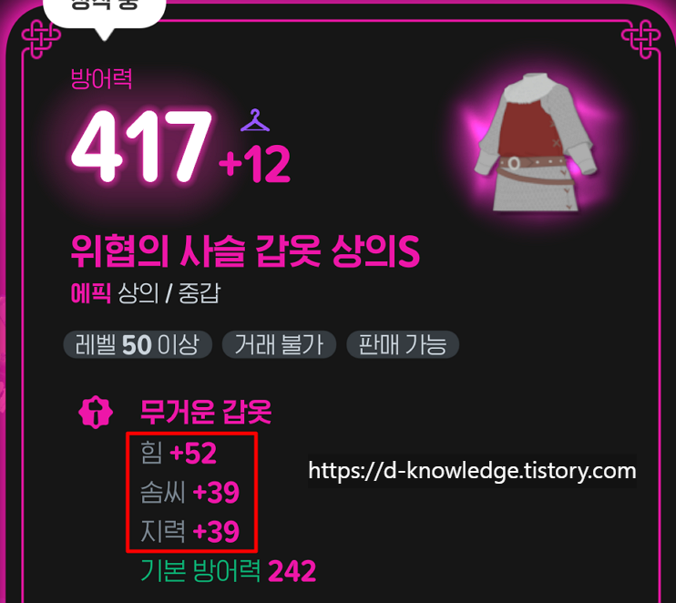 방어구는 힘, 솜씨, 지력 등 주요 능력치를 전반적으로 올려주지만, 특정 능력치를 더욱 많이 올려 줍니다.