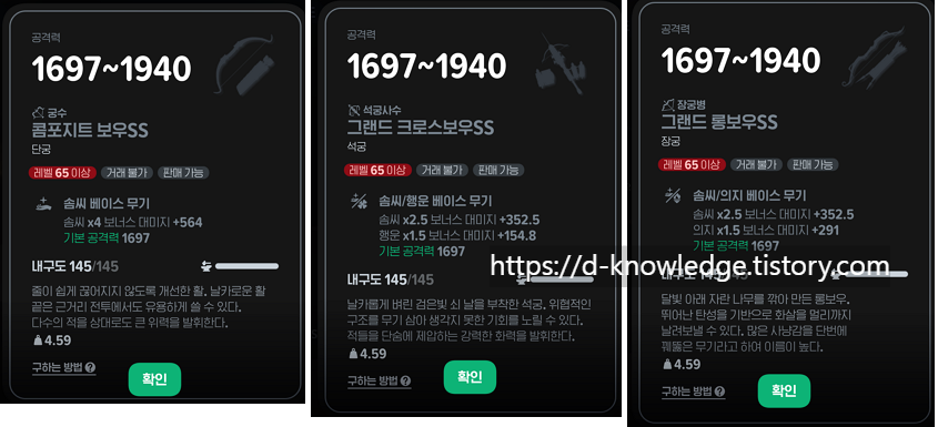 각 무기에는 특정 능력치 보너스가 존재하며, 이를 기준으로 장비를 선택하는 것이 가장 효율적입니다.