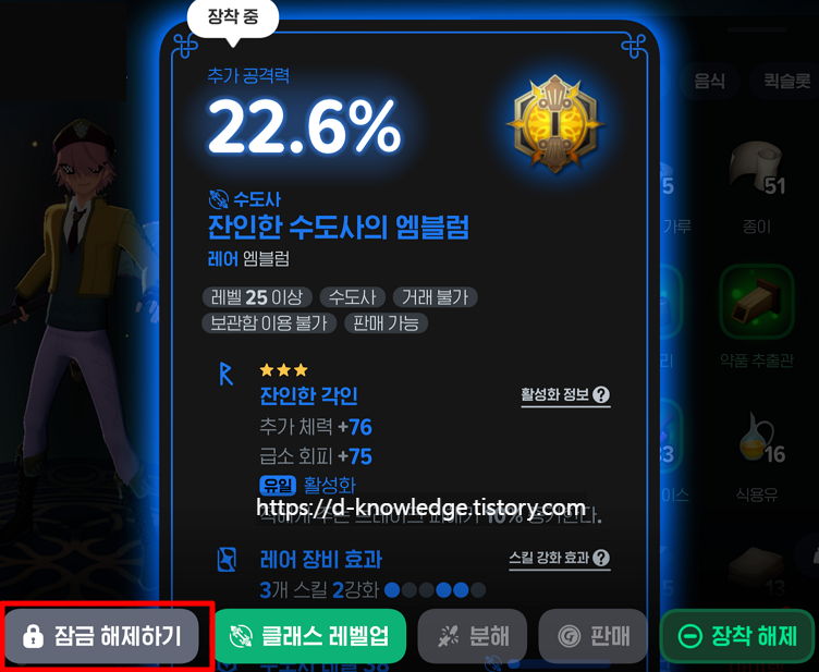 - 클래스에 맞는 엠블럼을 장착 할 수 있습니다.