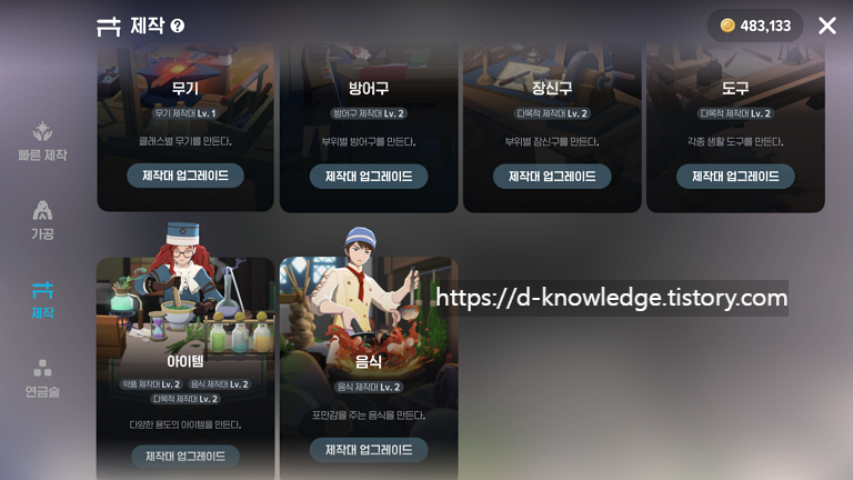 이 중 제작대와 가공 시설 업그레이드는 더 높은 단계의 아이템을 제작하기 위해 반드시 필요합니다.