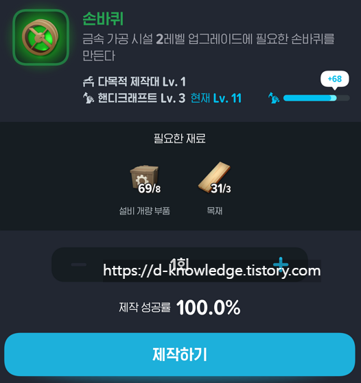 제작대와 가공 시설은 최대 레벨 3까지 업그레이드할 수 있으며, 단계가 올라갈수록 재료의 종류와 수량이 증가합니다.