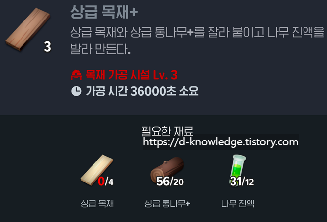 | 상급 목재 | 목재+ 3개, 상급 통나무 15개, 나무 진액 8개 |