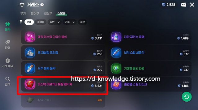 - 미스틱 패키지: 데카로 거래소에서 구매 가능(한번에 매력 8000 돌파)