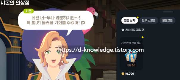 시몬 상점에서는 ‘기본 안경 선택 상자’를 구매할 수 있으며, 이 상자를 열면 매력을 150 상승시켜주는 안경을 획득할 수 있습니다.