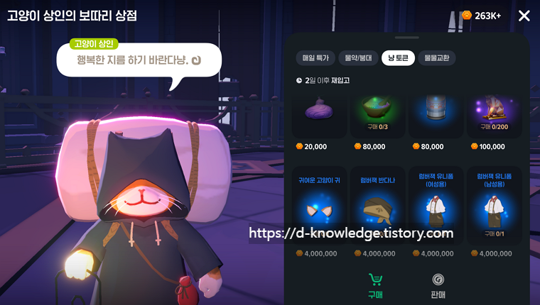 - 마을 에피소드 완료 시 등장 고양이 상인 (특별 판매 탭)