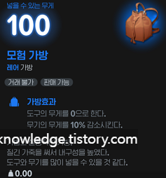 - 하트 토큰으로 여관 NPC에게서 구매 가능한 모험 가방을 사용하면 도구 무게가 0이 됩니다.