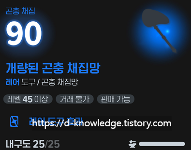 | 개량된 곤충 채집망 | 상급 목재 x3 | 못 x6 | 개량된 도구 부품 x1 |
