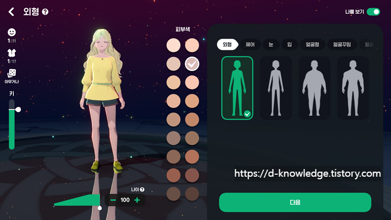 - 헤어, 눈, 입, 얼굴형 등 디테일 설정