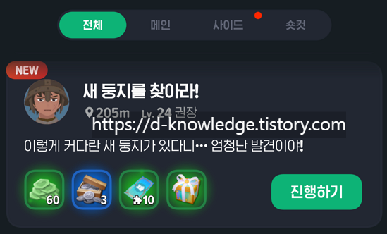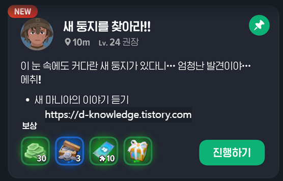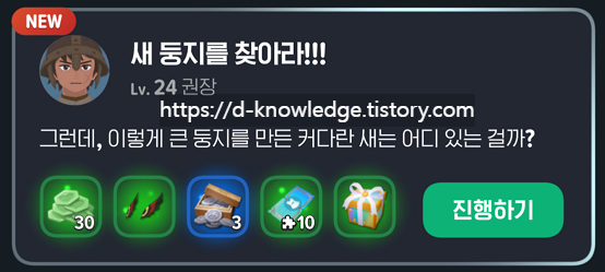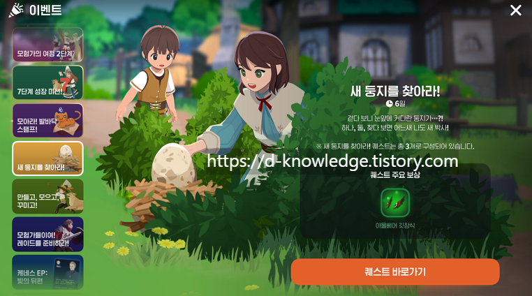 📍 이벤트 항목에서 "새 둥지를 찾아라" 클릭 → "퀘스트 바로가기" 선택