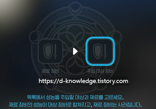 성능 주입은 재료 장비의 능력치가 현재 장비보다 높을 경우에만 가능합니다.