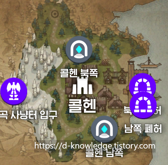 | 콜헨 | 용병 사무소 | 게렌 | 콜헨 북쪽 문게이트 정찰 | 콜헨북쪽 문게이트로 이동해서 상호작용 |