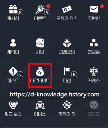 ▶ 메인 화면 오른쪽 상단의 [≡ 메뉴] → [아르바이트] 탭을 클릭하면 현재 수락 가능한 아르바이트를 확인할 수 있습니다.