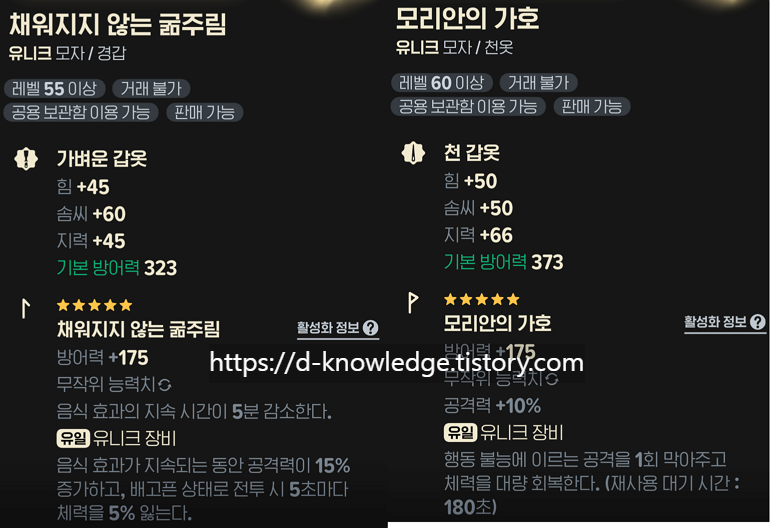 | 🍖 채워지지 않는 굶주림 | 음식 효과 지속 시간 5분 감소, 음식 효과 지속 되는 동안 공격력이 15% 증가하고, 배고픈 상태로 전투 시 5초마다 체력을 5% 잃음 |