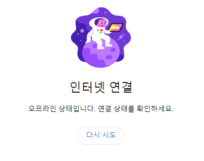 나의 경우는 위 그림과 같이 "오프라인 상태입니다. 연결 상태를 확인하세요." 라는 문구와 함께 다시 시도 버튼이 있었다.