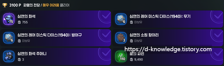 | 장비 | 심연의 레어 미스틱 다이스(1940): 방어구 | 20개 |