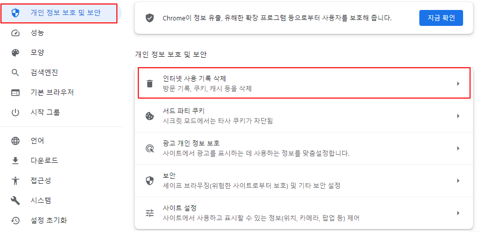 브라우저 설정에 접속하여, 개인 정보 보호 및 보안 탭에서 인터넷 사용 기록 삭제를 하여 캐시를 지우는 방법이다.