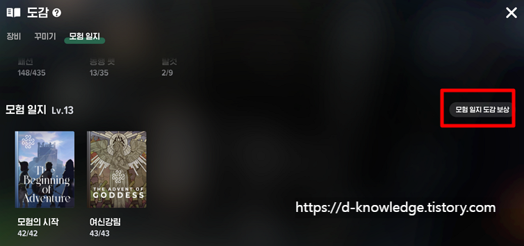 - 메뉴에서 도감 → 모험 일지 → 도감 보상으로 진입합니다.