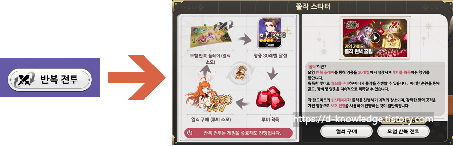 ✅ 이제부터 반복 전투를 시작하면 선택한 던전에서 자동으로 쫄작이 진행됩니다!