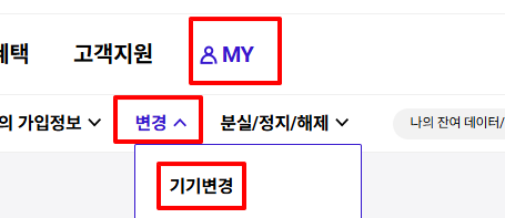 3. 티월드에 로그인 해서 My T를 누르고 상단 메뉴 중 '변경' -> '기기 변경'을 클릭한다.