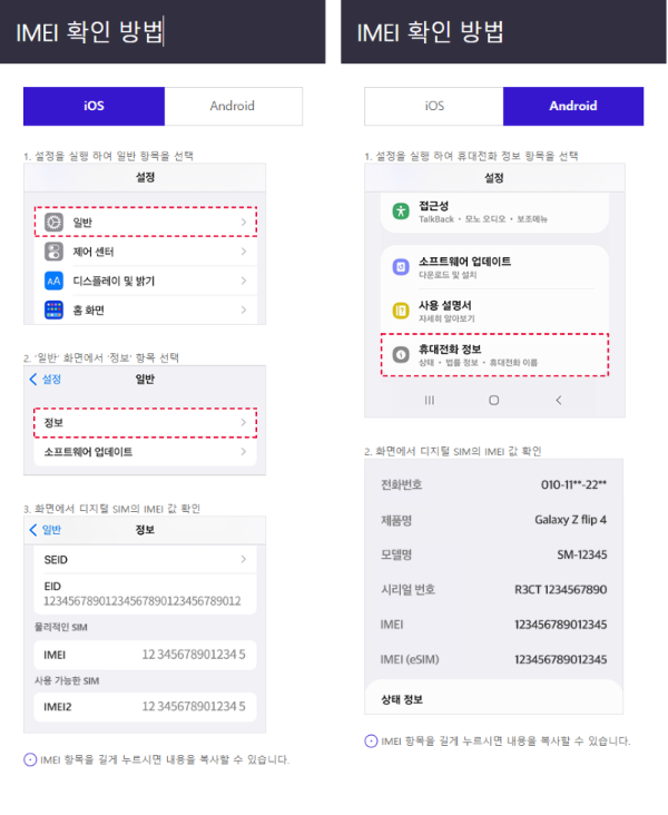 - IMEI 번호는 자급제폰의 박스나 핸드폰 설정에서 확인 가능하다.