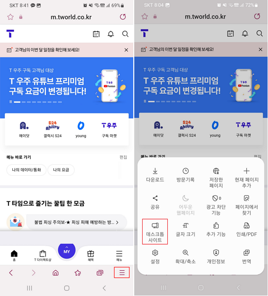 핸드폰에서 인터넷을 접속하면 모바일 모드라서 T월드를 접속해도 상단에 '변경' 메뉴가 보이지 않게 된다.