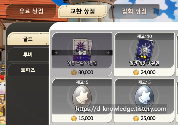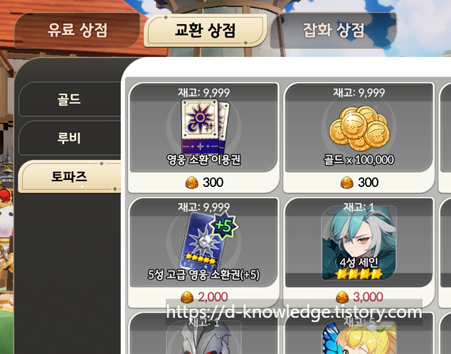 ❗ 토파즈는 영웅 뽑기나 장비 구입에도 사용되므로 신중하게 선택하세요.